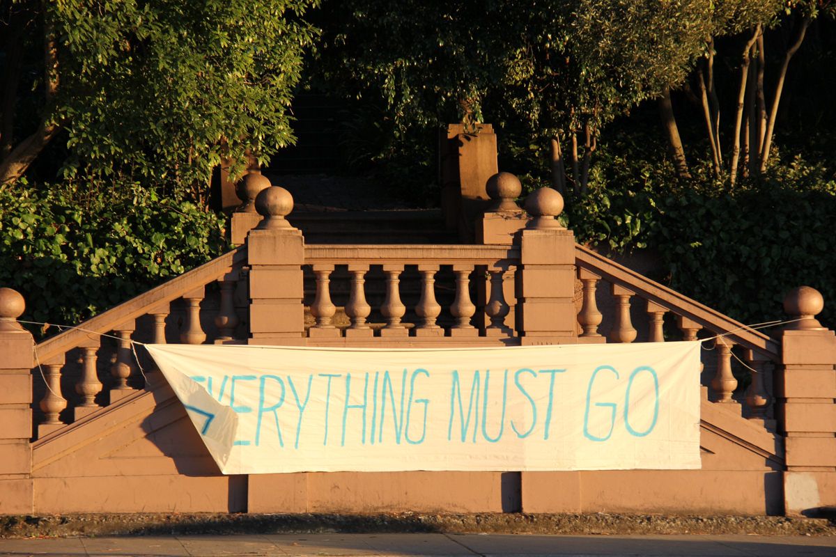 Muslin and spraypaint, 46 x 96 in. Installed on the south facade of CCA Campus, facing broadway.